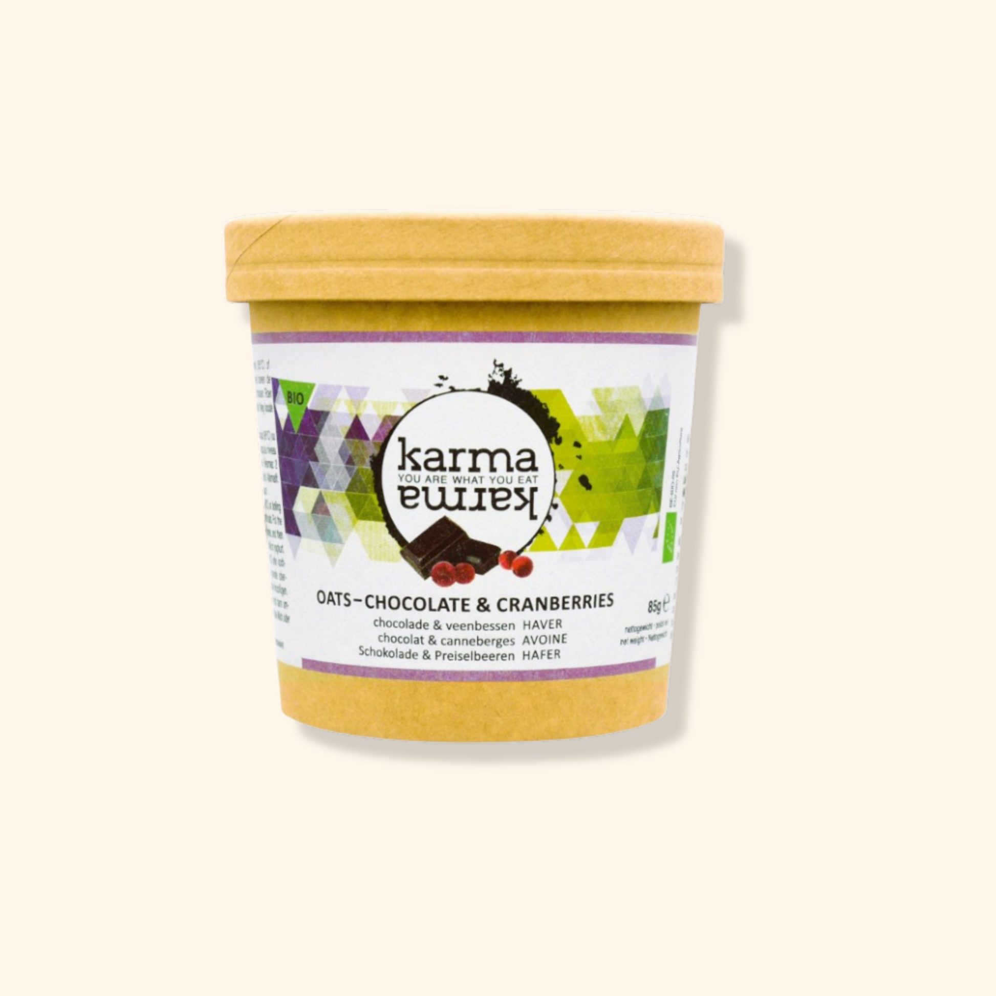 Bio havervlokkenmix met schilfers chocolade met minimum 70% cacao. Super lekker in combinatie met veenbessen en een snuifje cayennepeper voor die volle, pittige smaak.